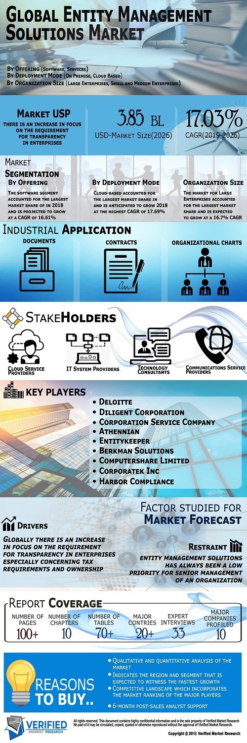 Entity Management Solutions Market was valued at USD 1.12 Billion in 2018 and is projected to reach USD 3.85 Billion by 2026, growing at a CAGR of 17.03% from 2019 to 2026.