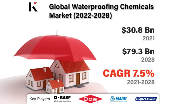 The Global Waterproofing Chemicals Market Size was valued at USD 30.8 Bn in 2021. The market is projected to grow USD 79.3 Bn in 2028, at a CAGR of 7.5%.