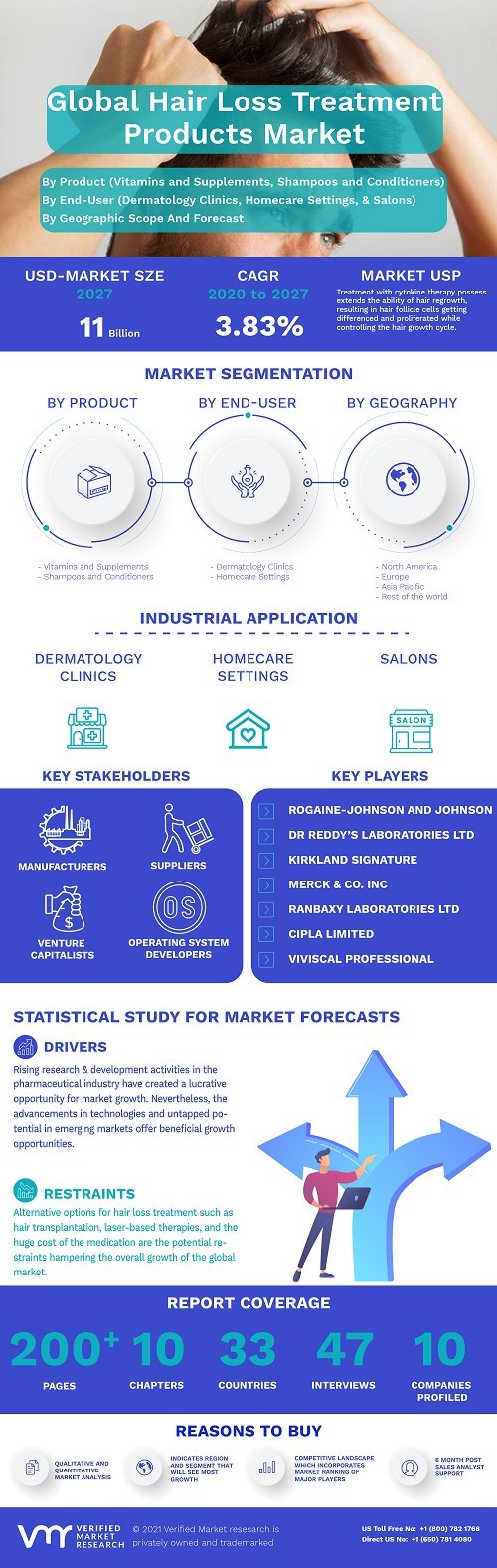 Hair Loss Treatment Products Market was valued at USD 8 Billion in 2019 and is projected to reach USD 11 Billion by 2027, growing at a CAGR of 3.83% from 2020 to 2027.