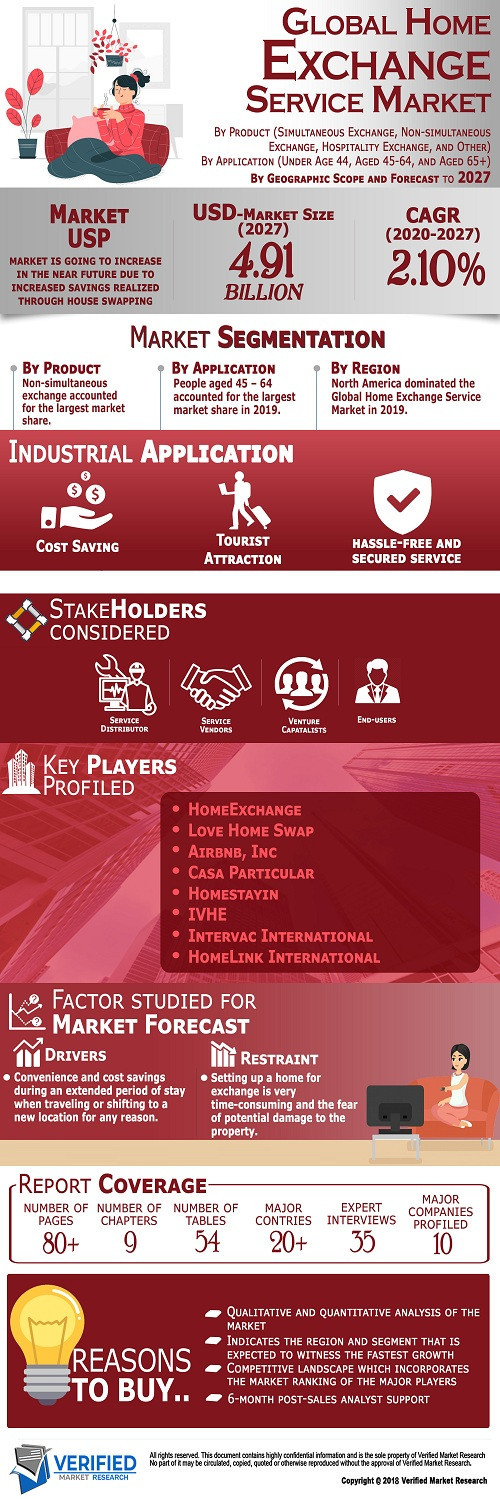 News Home Exchange Service Market Size By Product/Service, By Application smithjenny22119 929 views Home Exchange Service Market was valued at USD 4.72 Billion in 2019 and is projected to reach USD 4.91 Billion by 2027, growing at a CAGR of 2.10% from 2020 to 2027. « Previous Home Exchange Service Market