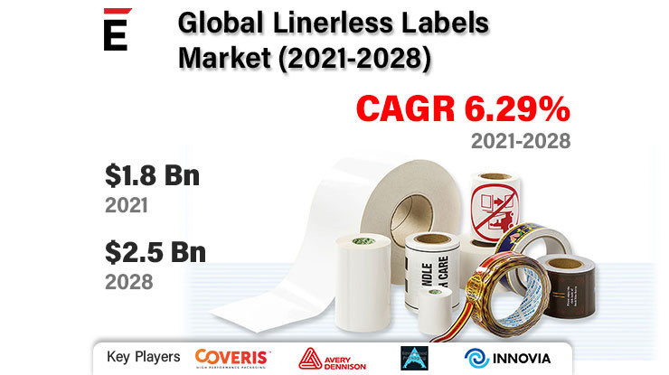 The global Linerless Labels Market size was valued at USD 1.8 billion in 2022. The market is projected to grow USD 2.5 billion in 2028, at a CAGR of 6.29%. Linerless labels are also called liner-free labels or backless labels. They are primarily utilized in the Food & Beverage industry to provide detailed information about the product and for branding. Brand owners constantly require linerless labels to market their seasonal and regional variants, while responding to market cues dynamically. With rising concerns about the amount of liner waste generated, linerless labels have gaining considerable traction in the packaging & labeling industry.