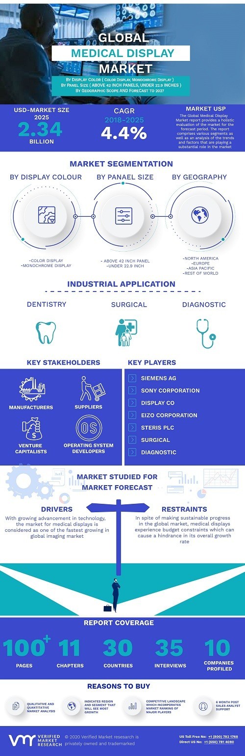 Medical Display Market was valued at USD 1.73 Billion in 2018 and is projected to reach USD 2.34 Billion by 2025, growing at a CAGR of 4.4% from 2018 to 2025.