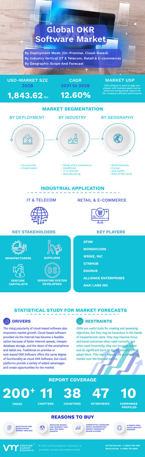News OKR Software Market Size By Component, By Deployment Mode, By Organization, By Industry Vertical, By Geographic Scope And Forecast smithjenny22119 1,178 views OKR Software Market size was valued at USD 742.29 Million in 2020 and is projected to reach USD 1,843.62 Million by 2028, growing at a CAGR of 12.60 % from 2021 to 2028. « Previous OKR software market