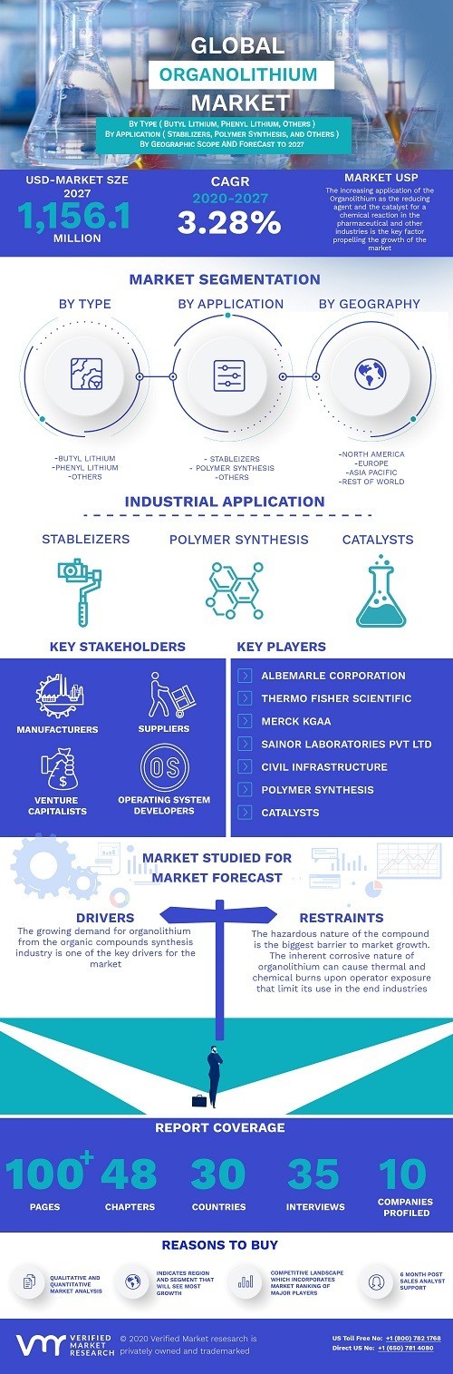 Organolithium Market was valued at USD 935.4 Million in 2019 and is projected to reach USD 1,156.1 Million by 2027, growing at a CAGR of 3.28% from 2020 to 2027.