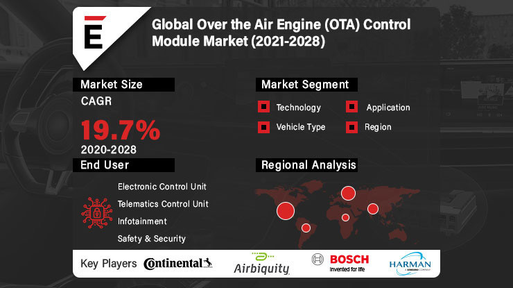The global Over the Air Engine (OTA) Control Module Market is projected to grow from USD 1,108.6 million in 2020 to USD 2,204.9 million by 2028 at a CAGR of 19.7% during the forecast period. In the field of engine and powertrain control, over the Air Engine (OTA) control module is an advanced concept. Various engine and vehicle operation parameters such as fuel mixture, emissions monitoring, ignition timing, fuel pump operation, ABS controls, engine cooling, and so on are controlled by the ECU/PCM in automobiles. Heavy and light commercial vehicles are among the first to implement this technology, with OEMs including their own self-designed OTA control module in the vehicles.