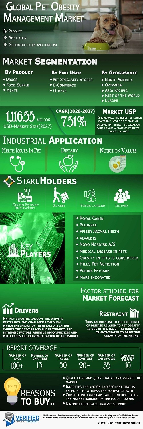 According to Verified Market Research, The Global Pet Obesity Management Market was valued at USD 633.04 Million in 2019 and is projected to reach USD 1,116.55 Million by 2027, growing at a CAGR of 7.51% from 2020 to 2027.