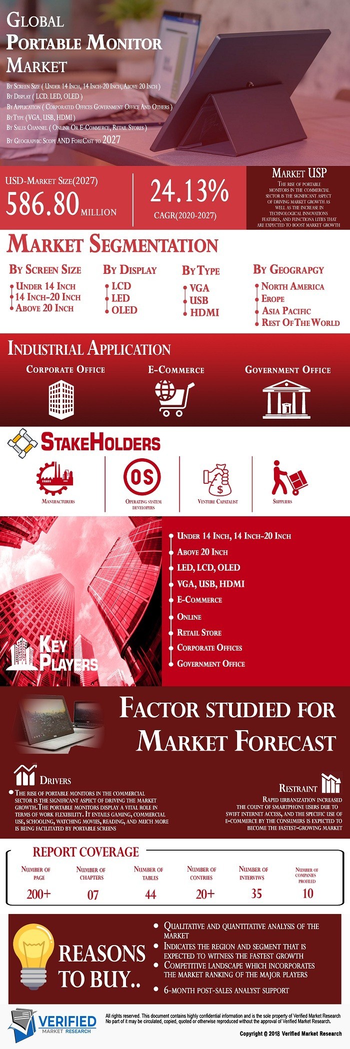 According to Verified Market Research, the Global Portable Monitor Market was valued at USD 111.28 Million in 2019 and is projected to reach USD 568.80 Million by 2027, growing at a CAGR of 24.13% from 2020 to 2027.