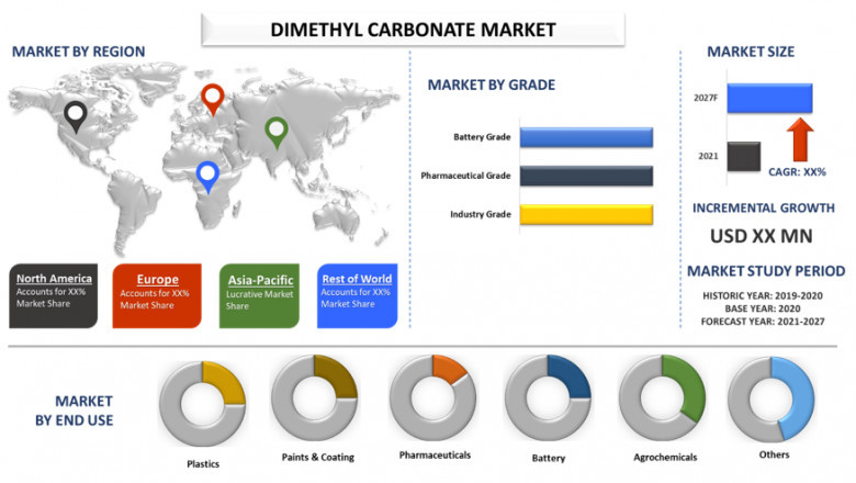 Dimethyl Carbonate Market was estimated to be around 822 million in 2020 and is anticipated to display a CAGR of around 6% over the forecast period (2021-2027). Dimethyl carbonate (DMC) is an important industrial chemical. It is also used as a chemical reagent, particularly for methylation and methoxy carbonylation reactions. It is used as an intermediate for making polycarbonate. Polycarbonate has wide applications in manufacturing compact disc, safety helmets, bullet-proof glass, car headlamp lenses, baby feeding bottles, roofing and glazing etc. due to its high strength, lightweight, good chemical and heat resistant. DMC is nontoxic to humans and does not negatively impact the environment, and is also quickly biodegradable, which makes it especially suitable for use as a chemical. Therefore, increasing demand for polycarbonates, battery electrolytes, reagents, and solvents would drive the market for DMC. However, use of highly toxic raw materials for DMC production would hamper the market growth of DMC.