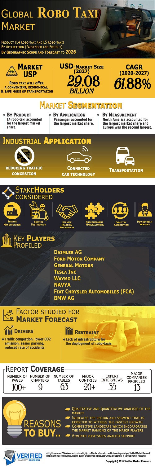 News Robo Taxi Market Size By Product (L4 robo-taxi and L5 robo-taxi), By Application smithjenny22119 789 views The Global Robo Taxi Market was valued at USD 399.30 Million in 2019 and is projected to reach USD 29.08 Billion by 2027, growing at a CAGR of 61.88% from 2020 to 2027. « Previous Robo Taxi Market
