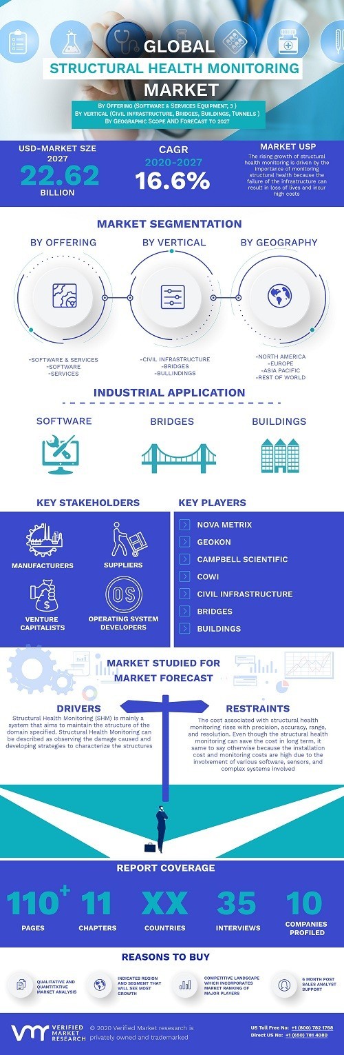 Structural Health Monitoring Market was valued at USD 7.94 billion by 2019 and is projected to reach USD 22.62 billion in 2027, growing at a CAGR of 16.6% from 2020 to 2027.