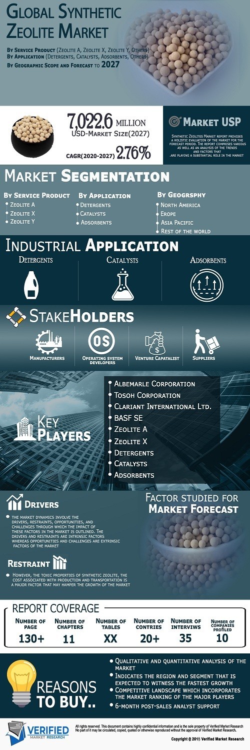 Synthetic Zeolites Market was valued at USD 5,639.7 Million in 2019 and is projected to reach USD 7,022.6 Million by 2027, growing at a CAGR of 2.76% from 2020 to 2027.