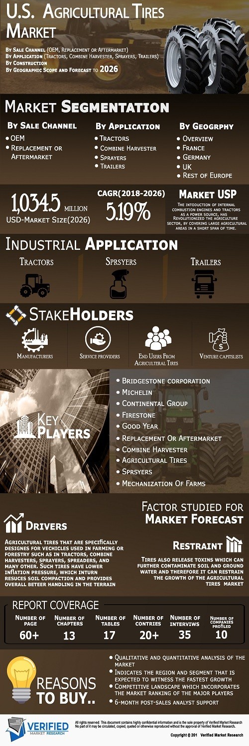 According to Verified Market Research, The U.S. Agricultural Tires Market was valued at USD 693.5 Million in 2018 and is projected to reach USD 1,034.5 Million by 2026, growing at a CAGR of 5.19% from 2018 to 2026.