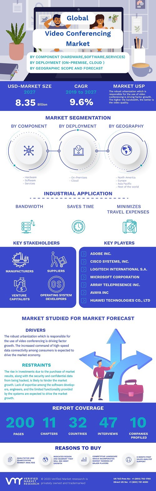 News Video Conferencing Market By Component, By End-Use, By Enterprise, By Deployment, Geography & Forecast smithjenny22119 1,598 views The Global Video Conferencing Market was valued at USD 4.02 Billion in 2019 and is projected to reach USD 8.35 Billion by 2027, growing at a CAGR of 9.6% from 2020 to 2027. « Previous Video Conferencing Market