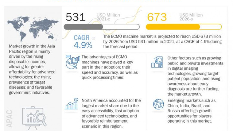 According to the new market research report ECMO Machine Market is expected to reach USD 673 million by 2026 from an estimated USD 531 million in 2021, at a CAGR of 4.9% from 2021 to 2026.