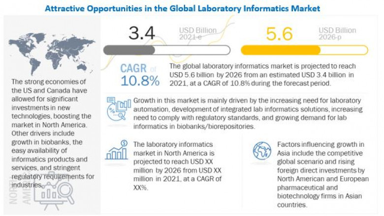 According to the new market research report Lab Informatics Market by Type of Solutions (LIMS, ELN, CDS, EDC, CDMS, LES, ECM, SDMS), Component (Software, Service), Delivery (On premise, Cloud), Industry (CRO, CMO, Pharma, Biotech, Chemical, Agriculture, Oil, Gas) - Global Forecasts to 2026, published by MarketsandMarkets™, the market is projected to reach USD 5.6 billion by 2026 from USD 3.4 billion in 2021, at a CAGR of 10.8% from 2021 to 2026.
