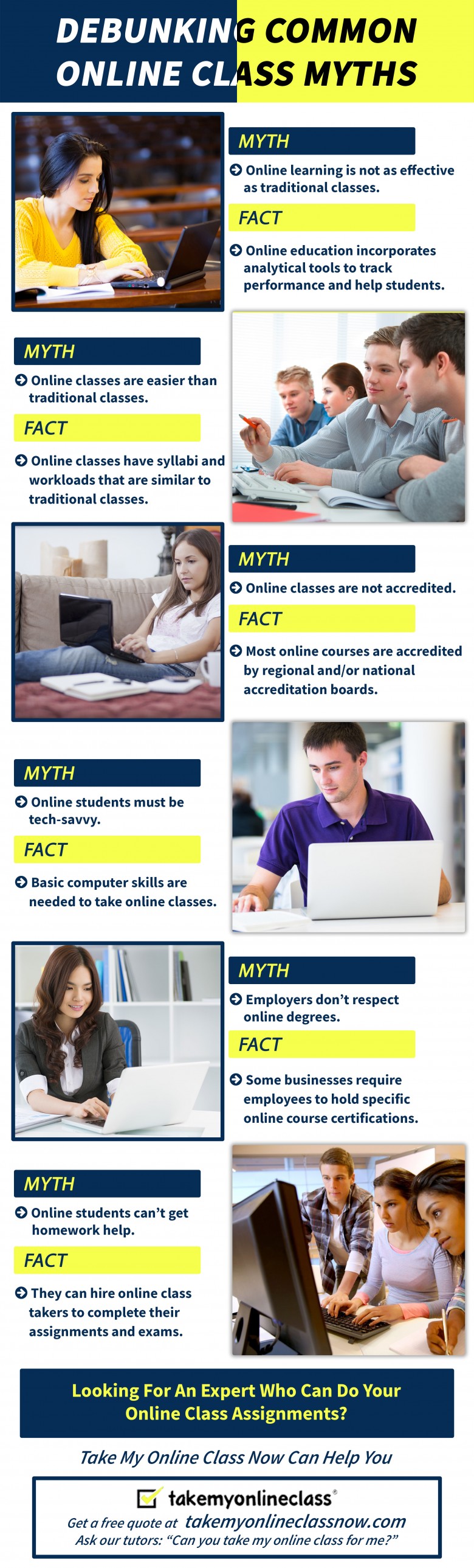 Have you ever heard someone say that online classes are too easy, not credible, useless, or worthless in the eyes of employers? These are all myths, and they’re explained in the below infographic. Read this so you can know what the facts and myths of online education are. Nearly anyone can enroll in an online class, and online class takers like us are always available to provide expert help. To know more, visit https://takemyonlineclassnow.com/.