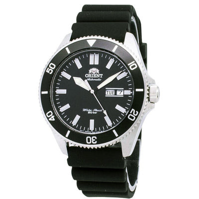 RA-AA0010B19B Orient Mako III Men's automatic 200m watch. This watch has a rubber band and a stainless steel case in addition to the following attributes: Automatic movement, day and date display at 3 o'clock, caliber F6922, 22 jewels, mineral crystal, black dial with luminous hands, and hour markers. A single-direction rotating bezel with a distinct "click" sound as you spin ensures that you can always tell where it is in the rotation cycle.
