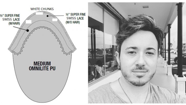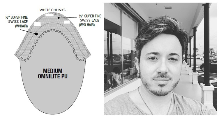 Below is a custom-made hair system required by Nate in the right picture. It has Swiss transparent lace in the front and super thin PU material in the back. The hair color is 1B30 in the front gradually transitioning to 1B20 in the back. The hair density is 95% in the front and becomes gradually thicker to 100% in the back. This custom order has three white chunks of hair added to the front hairline to create a very fashionable and cool appearance.