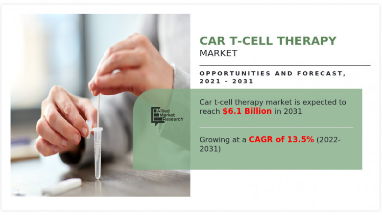 According to a new report published by Allied Market Research, titled, “CAR T-Cell therapy Market," The car t-cell therapy market was valued at $1.7 billion in 2021, and is estimated to reach $6.1 billion by 2031, growing at a CAGR of 13.5% from 2022 to 2031.