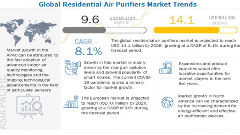 According to the new market research report "Residential Air Purifiers Market by Technology (High Efficiency Particulate Air (HEPA), Electrostatic Precipitators, Activated Carbon, Ultraviolet), Type (Portable Air Purifiers, In-duct Air Purifiers), COVID-19 Impact - Global Forecast to 2026", published by MarketsandMarkets™, the global Residential Air Purifiers Market is expected to reach USD 14.1 billion in 2026 from USD 9.6 billion in 2021, at a CAGR of 8.1% during the forecast period.
