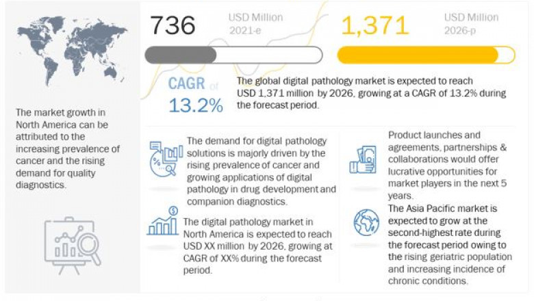 Digital Pathology Market by Product (Artificial Intelligence, Scanner, Software, Storage), Type (Human, Veterinary), Application (Teleconsultation, Training, Disease Diagnosis, Drug Discovery), End User (Pharma, Academia, Hospitals) - Global Forecast to 2026" The Global Digital Pathology market is projected to reach USD 1,371 million by 2026 from USD 736 million in 2021, at a CAGR of 13.2% during the forecast period. The growth in the digital pathology market is mainly driven by factors such as the increasing adoption of digital pathology to enhance lab efficiency, rising incidence of cancer, and growing applications of digital pathology in drug development and companion diagnostics. On the other hand, the high costs of digital pathology systems are expected to restrain market growth to a certain extent.
