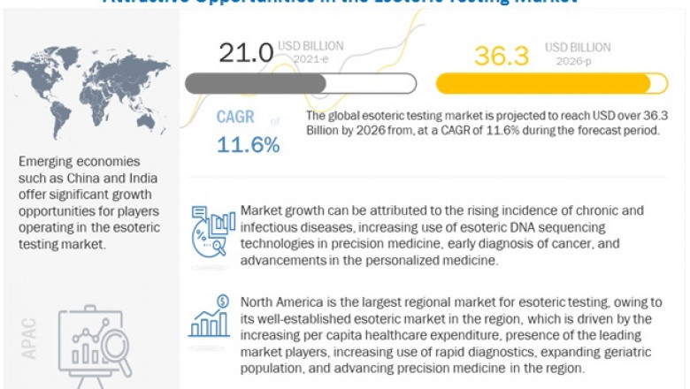 According to the new market research report "Esoteric Testing Market by Type (Infectious Disease, Endocrinology, Oncology, Toxicology, Immunology, Genetic Testing), Technology (MS, CLIA, ELISA, PCR), End User (Independent & Reference Laboratories, Hospital Laboratories) - Global Forecast to 2026", published by MarketsandMarkets™, the global market is projected to reach USD 36.3 billion by 2026 from USD 21.0 billion in 2021, at a CAGR of 11.6% during the forecast period.