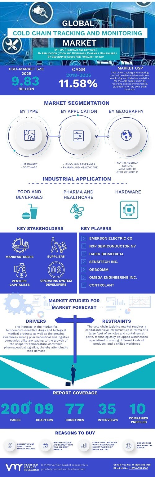 Cold Chain Tracking and Monitoring Market was valued at USD 4.4 Billion in 2019 and is projected to reach USD 9.83 Billion by 2027, growing at a CAGR of 11.58% from 2020 to 2027.