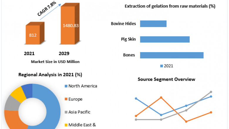 Collagen and Gelatin Market size was valued at USD 812 Mn. in 2021 and the total Collagen and Gelatin, revenue is expected to grow at 7.8% from 2022 to 2029, reaching nearly USD 1480.83 Mn.