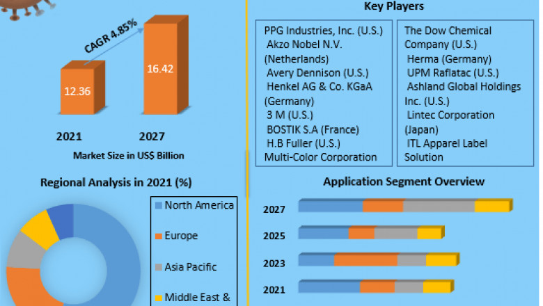 Label Adhesive Market was valued at USD 12.36 in 2021 and is expected to reach USD 16.42 Bn by 2027 at a CAGR of 4.85% over the forecast period 2022-2027.