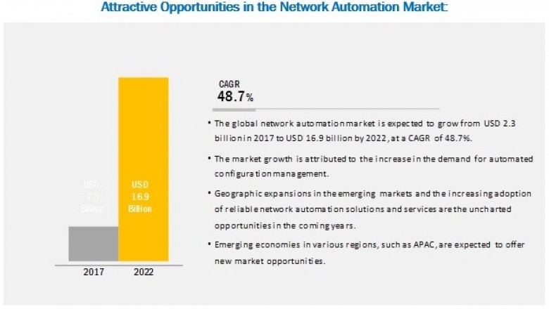 According toa new market research report” Network Automation Market by SD-WAN, Network Automation Tool, Intent-Based Networking, NetworkInfrastructure (Physical, Virtual, and Hybrid Network Configuration, andAutomation), Service, Deployment, Vertical, and Region - Global Forecast to2022", publishedby MarketsandMarkets™, The network automation market size is expected to growfrom USD 2.3 billion in 2017 to USD 16.9 billion by 2022, at a Compound AnnualGrowth Rate (CAGR) of 48.7% during the forecast period.