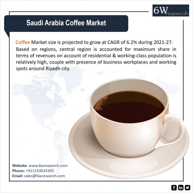 Saudi Arabia Coffee Market size is projected to grow at CAGR of 6.2% during 2021-27. Based on regions, central region is accounted for maximum share in terms of revenues on account of residential & working-class population is relatively high, couple with presence of business workplaces and working spots around Riyadh city.