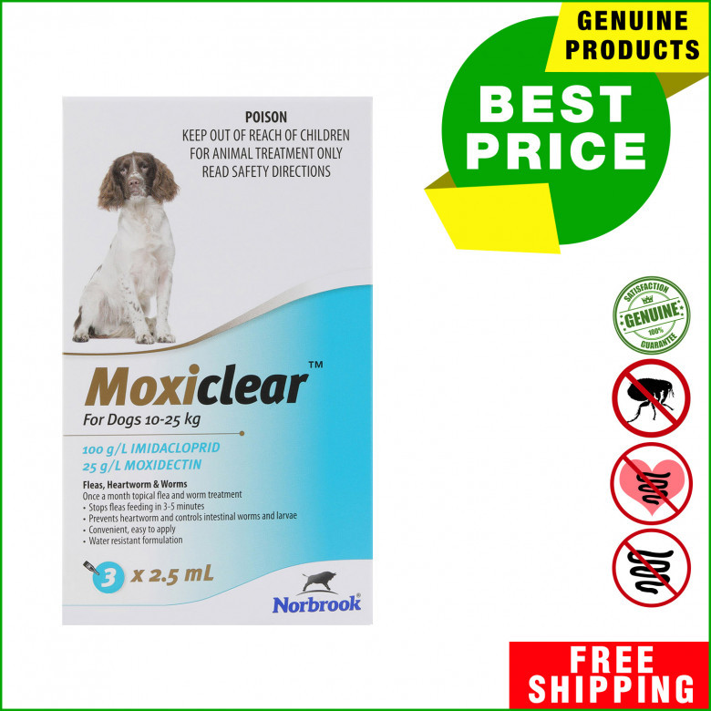 Moxiclear for dogs 10-25kg is intended to be all-around parasite prevention for your dog. Covering fleas, heartworm and intestinal worms, all you’ll have to do is to apply it each month. This topical spot-on reduces irritation caused by fleabites and stops fleas feeding in 3-5 minutes. Moxiclear is a water-resistant product that is simple to use. We offer free shipping across Australia as well as low prices.