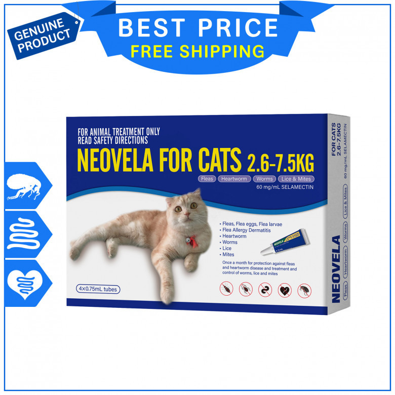 Neovela is a topical treatment for cats that kills multiple parasites. This monthly treatment kills adult fleas, flea eggs, and flea larvae in the environment, protecting against flea infestations and dermatitis caused by flea allergies. It can also be used to treat and control intestinal hookworms and roundworms as well as ear mite, sarcoptic mange, and lice. We offer the lowest market price and the quickest delivery.