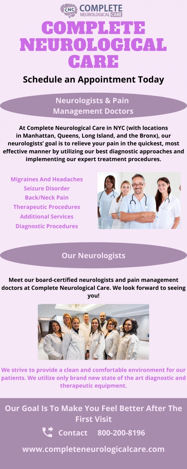 Complete Neurological Care is the group of board-certified best neurologist in NJ and pain management specialists. Our local neurology and pain management practice is located conveniently near Main Avenue in Downtown Passaic. Visit our New Jersey neurology practice for compassionate care and lasting relief. For more information, contact us at 800-200-8196.