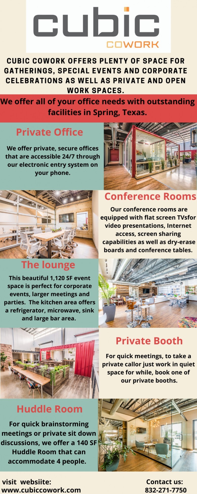 Cubic CoWork provides on rent office suite in the Woodlands. You can set your business with your entire team in this office and can run it as yours. This can be an exciting turning point for your business. Cubic Cowork can help you with all your commercial needs. For more information contact us at 832-271-7750.