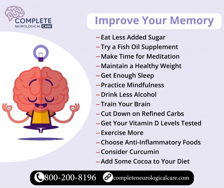 Harvard Medical School states one must exercise for 150 minutes per week and sleep for 7-8 hours per night to improve memory. Even mindfulness, eating a nutritious diet, choosing anti-inflammatory foods, etc., can also help. Complete Neurological Care understands how to diagnose and potentially treat/manage problems related to memory.