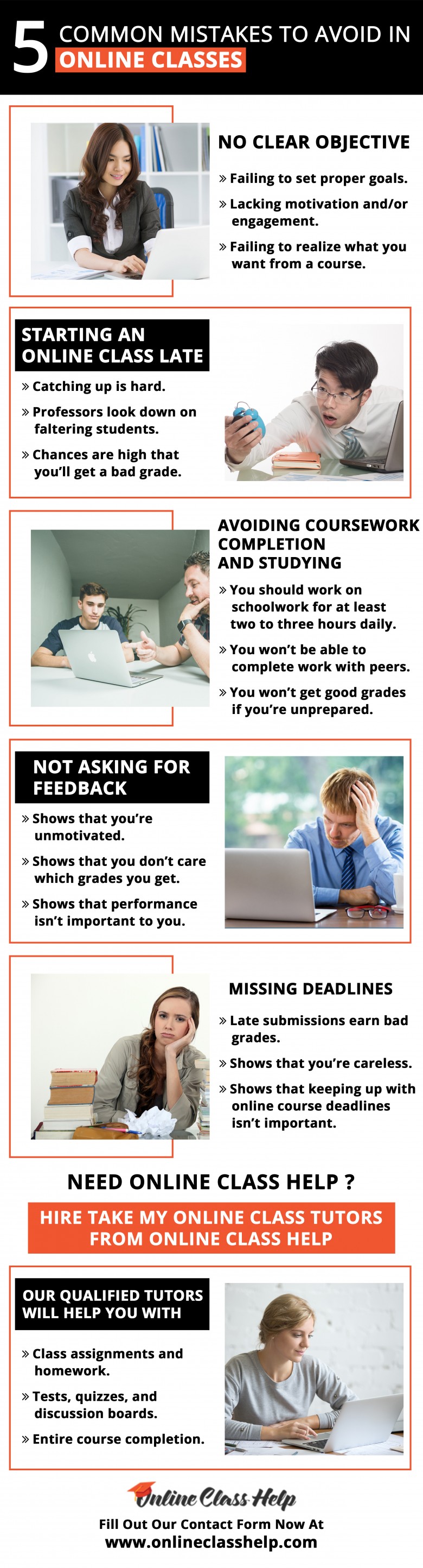 Having a hard time with online classes? We can help! This infographic shows the five common mistakes you must avoid in online classes. And if you need an online class tutor to help you get As and Bs, we can assist you with this too. Call us and ask, "Can I pay someone to take my online class?" Visit https://www.onlineclasshelp.com to learn more.