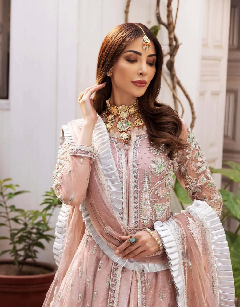 Chiffon salwar suits are very trendy. This pastel-colored Salwar style is making Mehndi and Sangeeth more popular in Pakistan. The floral thread embroidery enhances the relaxing peach color in dark pink. Further embellishments include gold and crystals.