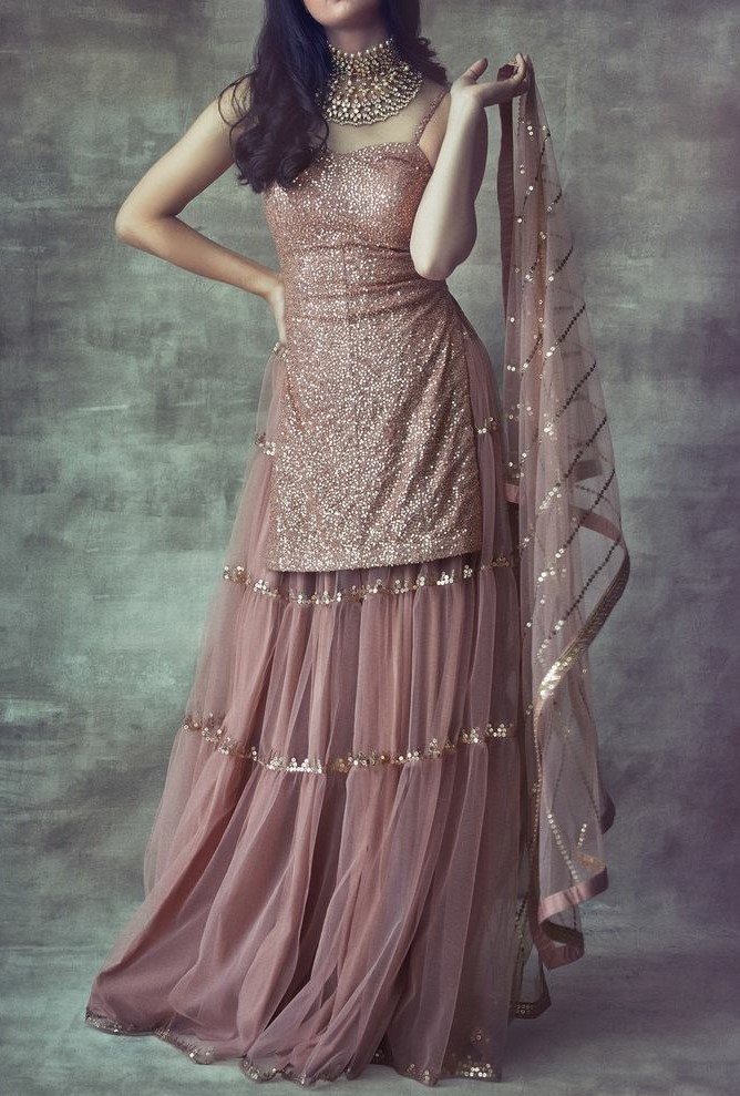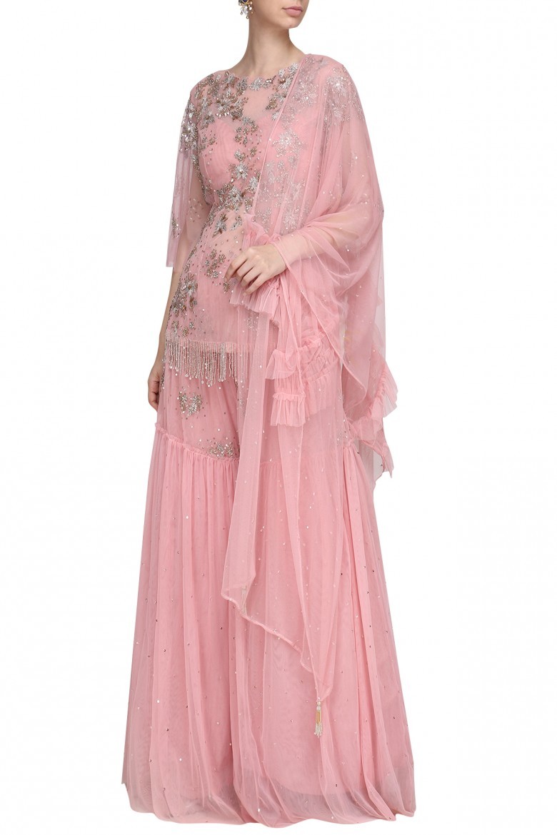The sharara suits are usually compared with gharara pants and they do resemble strongly to each other but the minor difference is that the flared pants in gharara are joined above the knee. Gharara suits is known as a common attire of Pakistani salwar kameez for Muslim women across the globe.