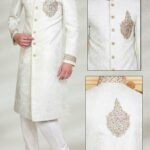 Fashion Self White Sherwani edena farley 1,453 views Get best ethnic look with this self white color sherwani with golden & red work on Ban & left chest side, full conceal button placket and paired with trousers, a perfect Groom wear. « Previous