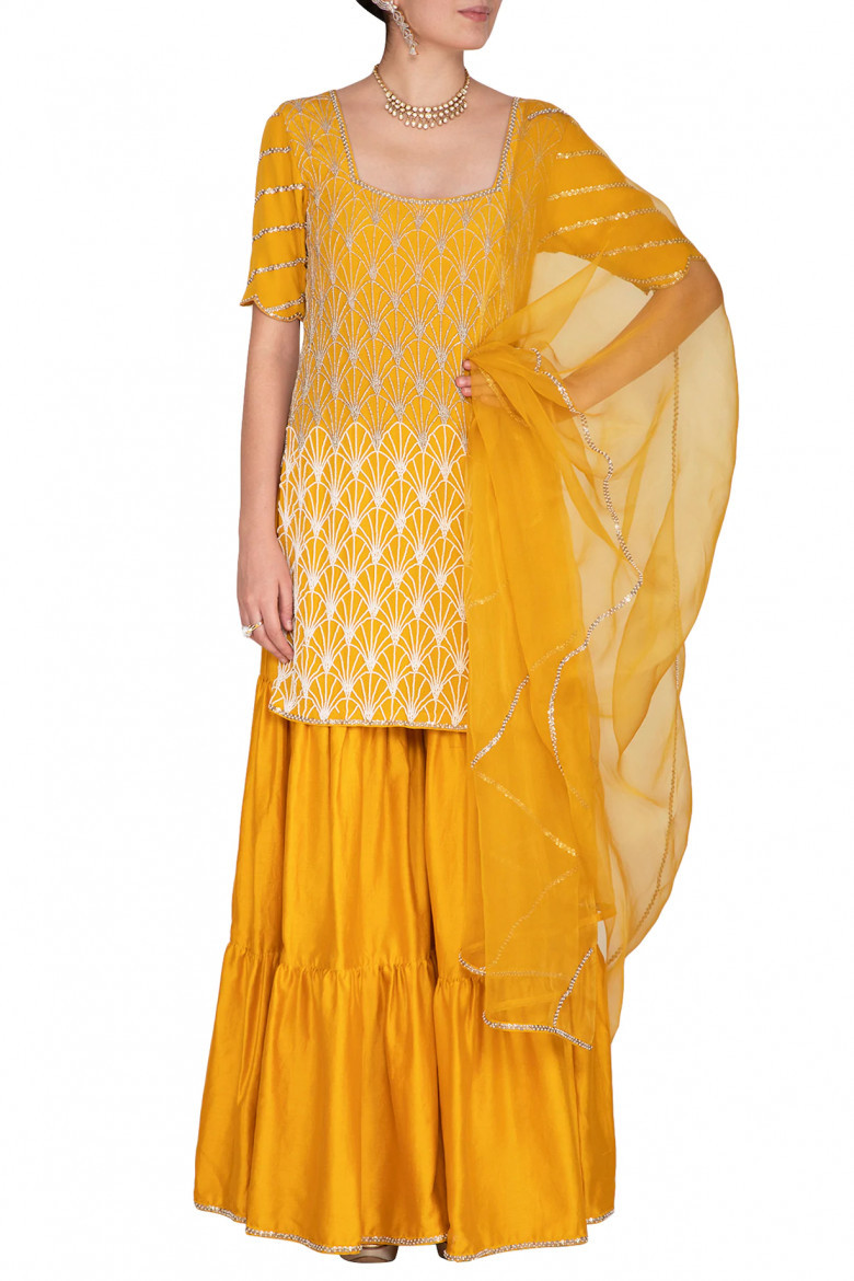 Embroidered top with attached drape sharara pants is the latest fashion trend of sharara sharara dress style is the sharara pants and short top or crop top. Wearing a fitted short kurti with flared sharara pants can enhance the overall effect of a sharara suits.