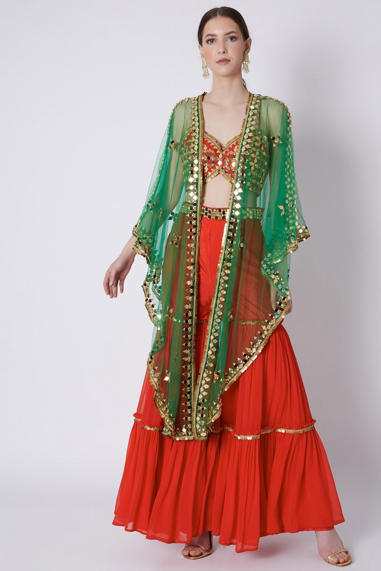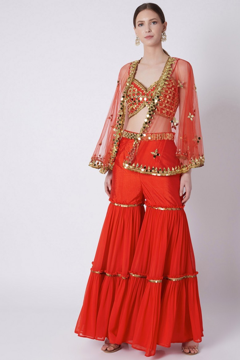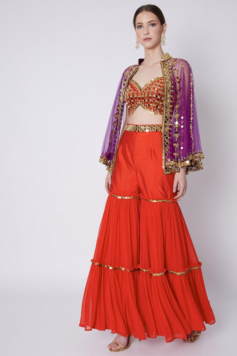 A trendy and modern twist to the sharara is pairing it with a crop top. This combination can easily be worn at weddings as well as smaller events and parties. For women who love to layer up, pair a nice embellished jacket with the crop top and sharara pants and rock the Indo-Western look!