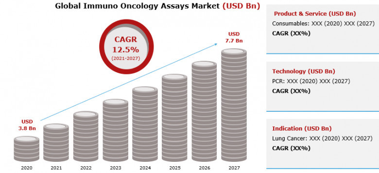 The Immuno Oncology Assays Market size was valued at US$ 3.8 Bn in 2020 and is expected to grow at a compound annual growth rate (CAGR) of 12.5% for the forecast period ending 2027 reaching a Market value of US$ 7.7 Bn.