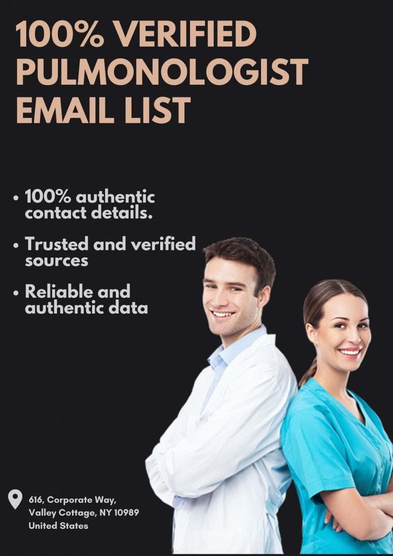 The growing prevalence of inaccurate Pulmonologist Mailing Lists is the driving force behind our strict 7-step verification process, beginning with data authentication and ending with data privacy compliance. Our numerous preventive measures facilitate smoother and obstacle-free strategy implementation. As the geographically-segmented Pulmonologist Email Database covers the entire US, you can expand your outreach and widen your customer network. You may have criteria other than physical location that greatly influence your business. You can request customized Pulmonologist Email Lists that fulfill these criteria and get data attributes, including practice specialty, certifications, and business and mailing address. Your made-to-order lists are not resold to help you retain your leads beyond the purchase cycle. Get the data delivered in less than 5 days, the fastest delivery speed in the industry, and reduce your integration costs with CRM-friendly files. Choose wisely from our meticulous lists-