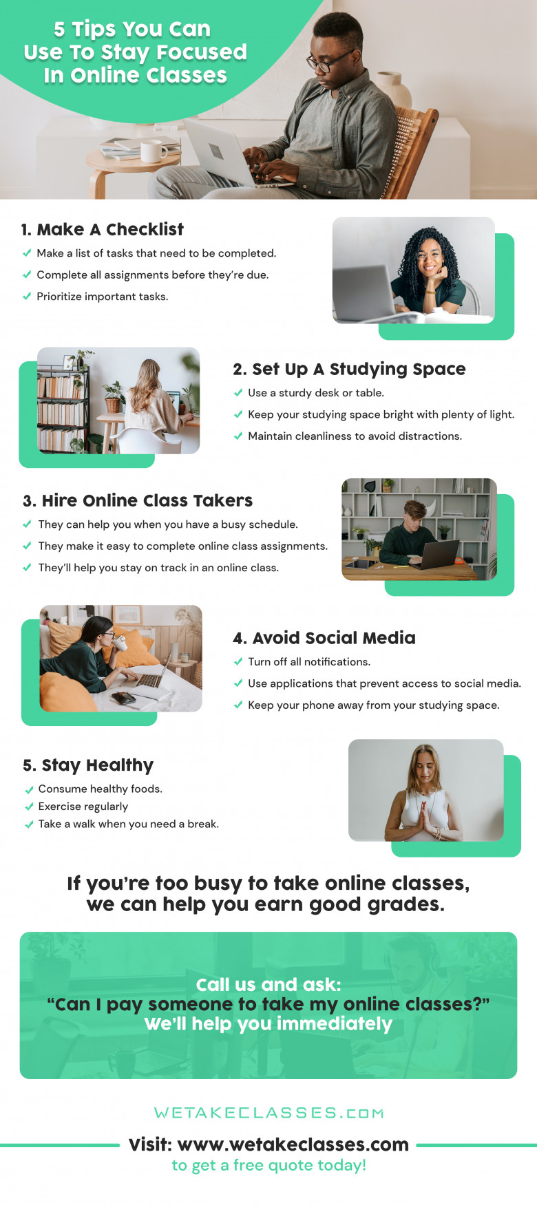 Staying focused in online classes will help you earn good grades. Here are five tips you can use to stay focused in online classes. At We Take Classes, we help online students hire expert tutors, and they can complete homework assignments, essays, and exams. Call us and ask: “Can I pay someone to do my online class?” We’ll help you immediately. Visit https://www.wetakeclasses.com/ for more information.