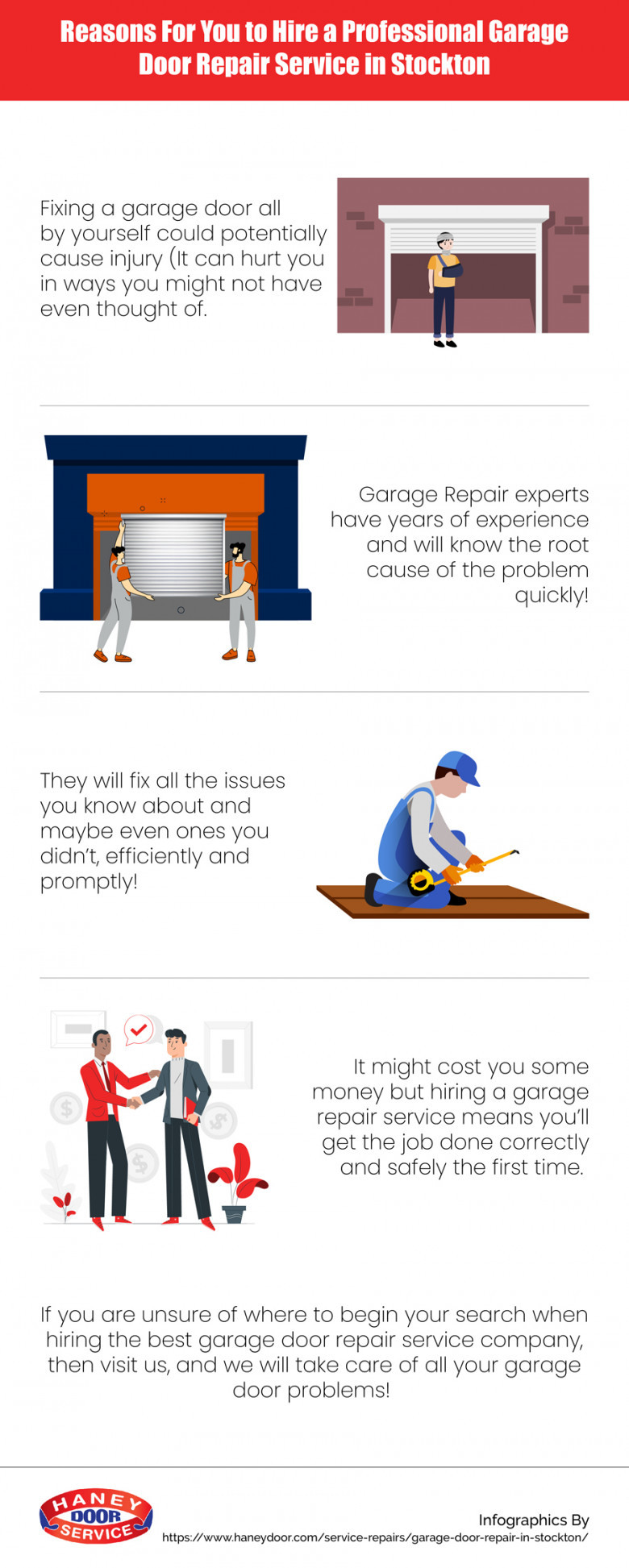Have you been trying to fix your garage door on a regular basis, and it still isn’t back to working normal? Well, it’s time for you to call for a professional garage door repair Stockton company. Hiring a professional can make a huge difference as they have a lot of wisdom, specialty tools and experience. Let’s have a look at this infographic: https://haneydoor.com/blog/reasons-for-you-to-hire-a-professional-garage-door-repair-service-in-stockton/ .