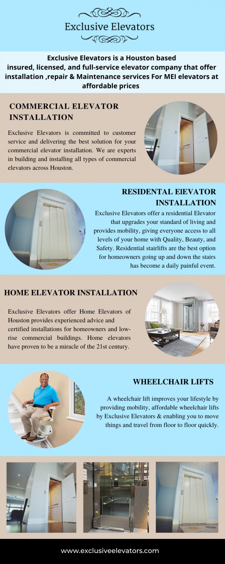 Exclusive Elevator is the best company for Handicapped people in TX. We offer a residential Elevator that upgrades your standard of living and provides mobility, giving everyone access to all levels of your home with Quality, Beauty, and Safety. Residential stairlifts are the best option for homeowners; going up and down the stairs has become a daily painful event. For more information, Contact us at 713-589-9171 or visit our website: