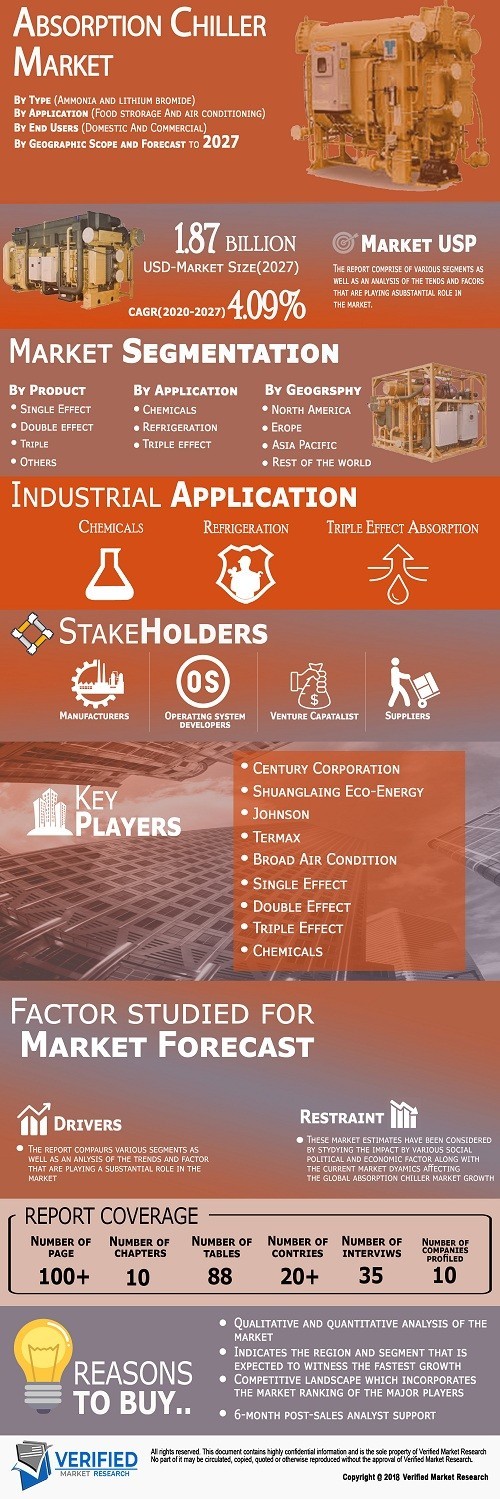 Absorption Chiller Market was valued at USD 1.37 Billion in 2019 and is projected to reach USD 1.87 Billion by 2027, growing at a CAGR of 4.09% from 2020 to 2027.