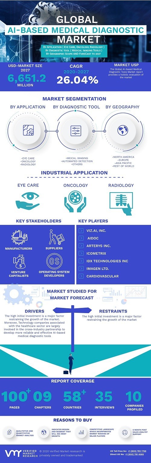 AI-based Medical Diagnostic Tools Market was valued at USD 1,035.7 Million in 2019 and is projected to reach USD 6,651.2 Million by 2027, growing at a CAGR of 26.04% from 2020 to 2027.