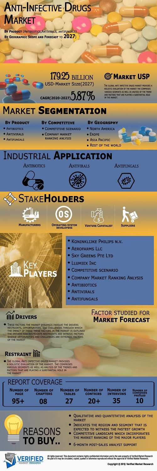 News Anti-Infective Drugs Market Size By Product (Antibiotics, Antivirals, and Antifungals) smithjenny22119 1,665 views Anti-Infective Drugs Market was valued at USD 107.47 Billion in 2019 and is projected to reach USD 179.25 Billion by 2027, growing at a CAGR of 5.87% from 2020 to 2027. « Previous Anti-Infective Drugs Market